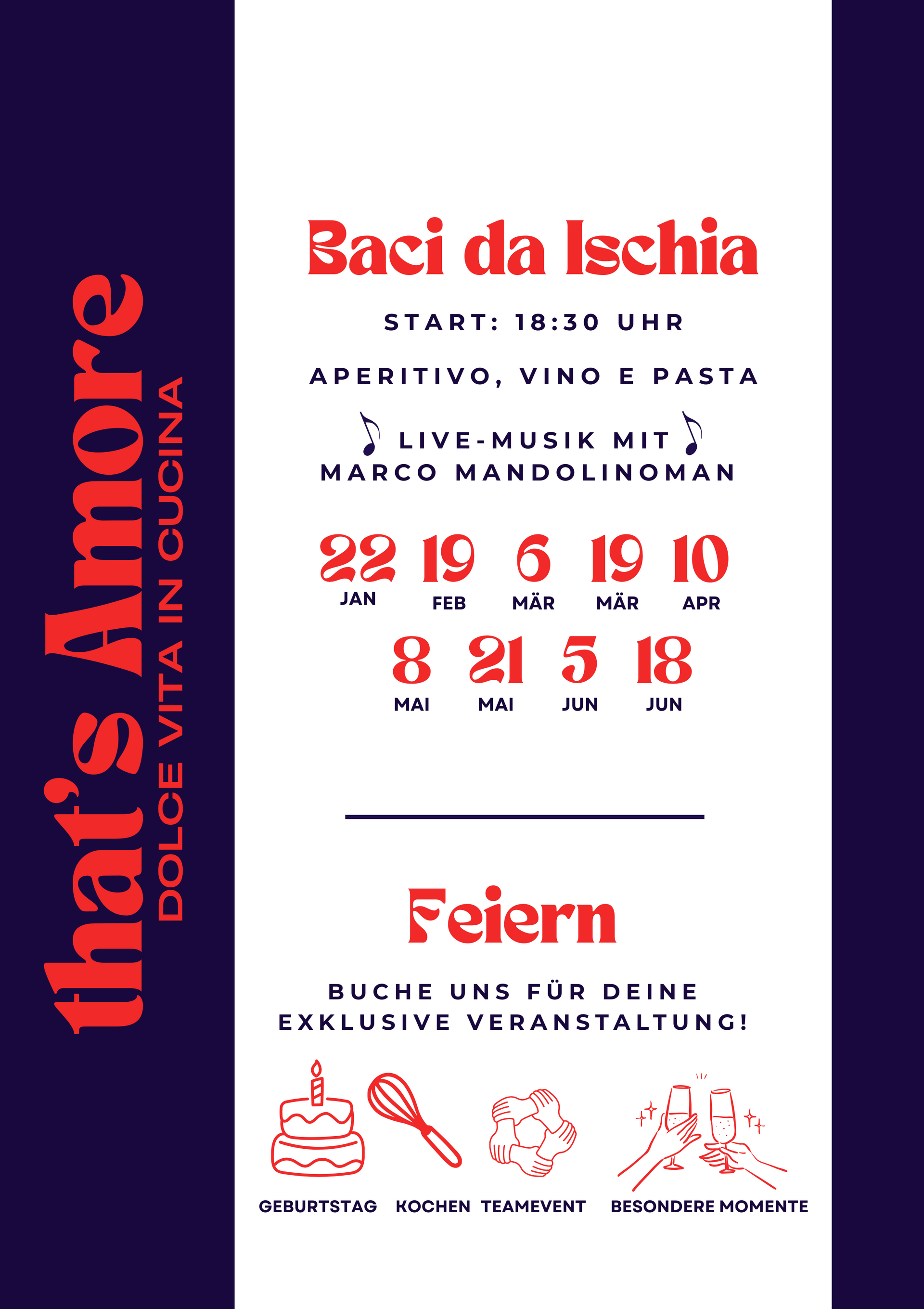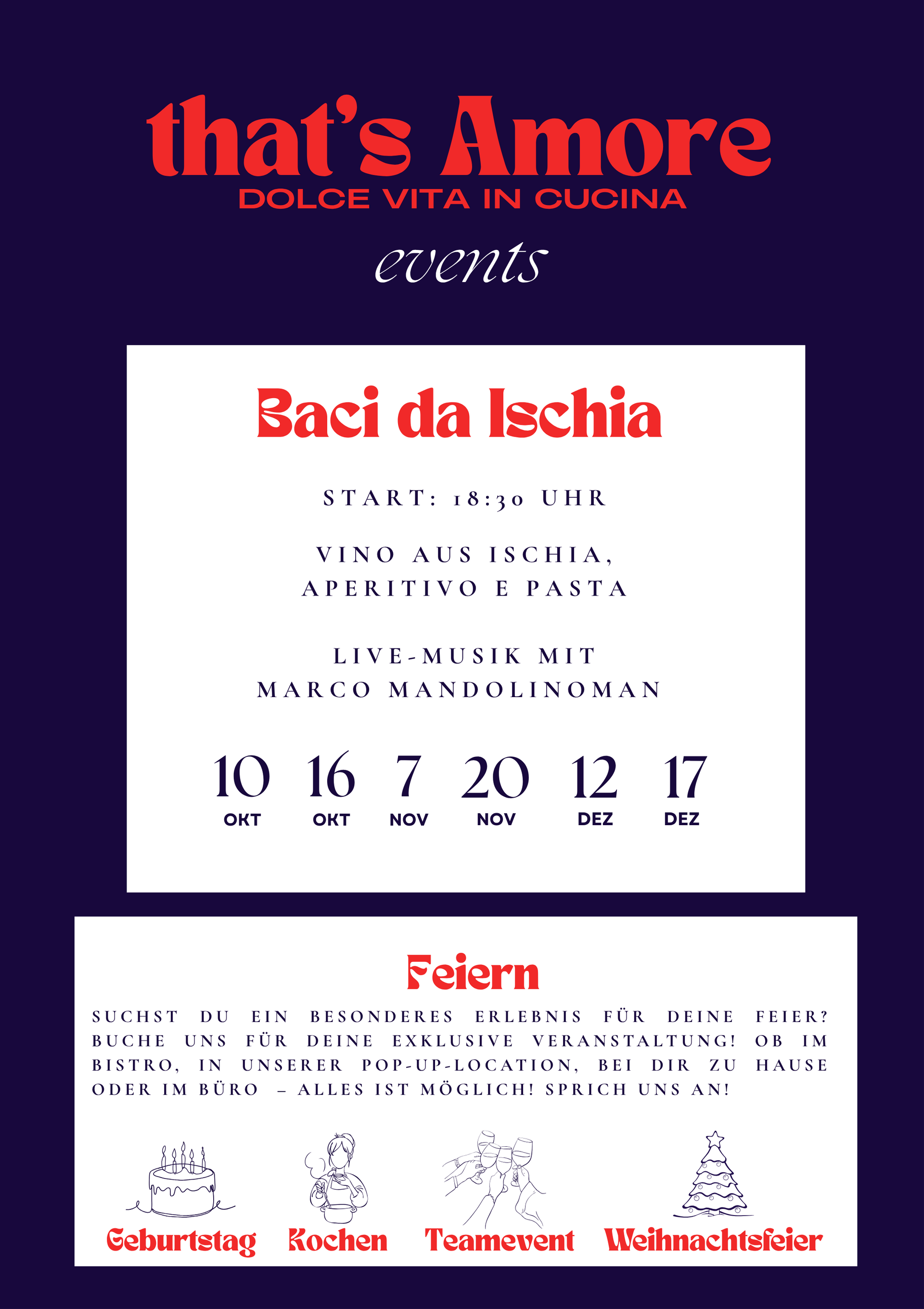 Wir nehmen dich mit auf eine einzigartige kulinarische Reise nach Ischia – Dolce Vita inklusive! Wir veranstalten regelmäßig in München that's Amore-Abende mit köstlichen Gerichten, mit Verkostung von exklusivem Wein aus Ischia, und mit Live-Musik. Entdecke mehr über unsere that's Amore-Abende.