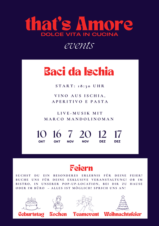 Wir sind auf der Suche nach der perfekten Location für unsere that's Amore-Abende. Sobald wir eine geeignete Location gefunden haben, werden wir Euch über die neuen Termine informieren!